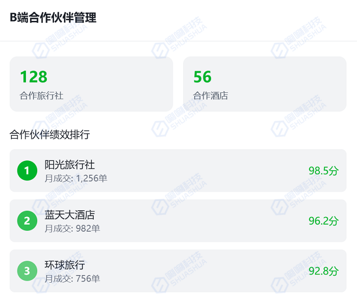 為旅行社、酒店等合作方開通主賬號+子賬號體系,支持在線查位、一鍵鎖票、自動對賬。主賬號可分配子賬號權限,并設置差異化返傭比例。系統(tǒng)生成分銷商績效看板,按帶客量、成交金額排序,并基于歷史數(shù)據(jù)推薦高潛力產品,助力合作方精準營銷,深化生態(tài)合作。