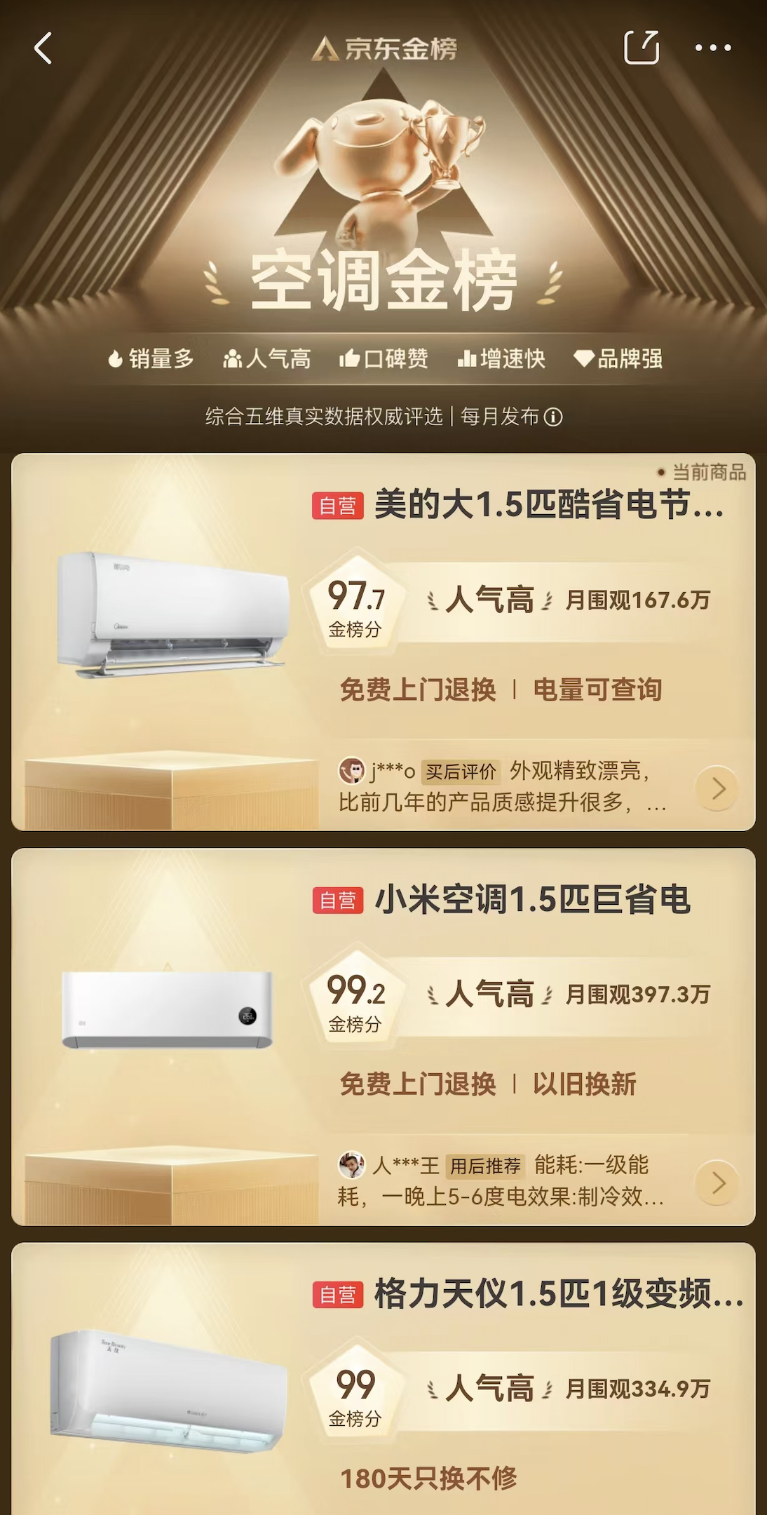 京東雙十一于10月9日晚8點正式啟動。截至開售28小時,美的酷省電系列空調(diào)表現(xiàn)強勢,不僅奪得京東“競速榜”2匹及以上掛機累計榜冠軍,更以97.7的高分登頂京東空調(diào)金榜,實現(xiàn)銷量與口碑的雙重領(lǐng)跑。