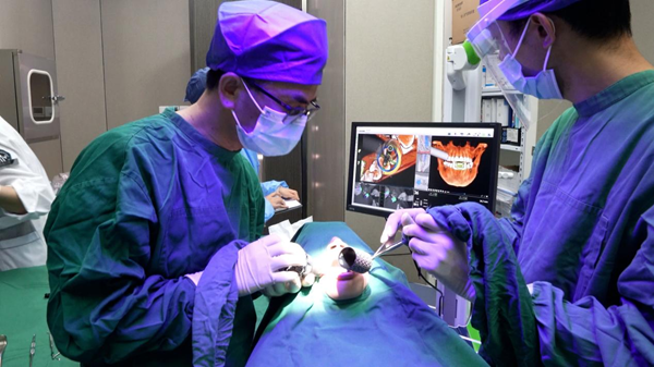 術(shù)前CT數(shù)據(jù)與口掃模型結(jié)合生成頜骨立體模型,術(shù)中實時顯示器械與口腔組織的空間關(guān)系,幫助醫(yī)生把控種植角度與深度。