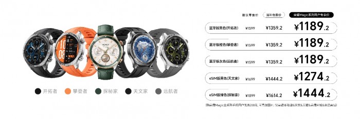 目前,榮耀手表5 Pro已開(kāi)啟首銷,共有藍(lán)牙和eSIM兩個(gè)版本可選,其中藍(lán)牙版本,攀登者(橙色)、開(kāi)拓者(黑色)、遠(yuǎn)航者(灰色)首銷國(guó)補(bǔ)優(yōu)惠價(jià)1359.2元;eSIM版本,天文家(黑色)首銷國(guó)補(bǔ)優(yōu)惠價(jià)1444.2元,探秘家(綠色)首銷國(guó)補(bǔ)優(yōu)惠價(jià)1614.2元。首銷期榮耀Magic系列用戶,攀登者、開(kāi)拓者、遠(yuǎn)航者專享國(guó)補(bǔ)優(yōu)惠價(jià)1189.2元,天文家專享國(guó)補(bǔ)優(yōu)惠價(jià)1274.2元,探秘家專享國(guó)補(bǔ)優(yōu)惠價(jià)1444.2元。