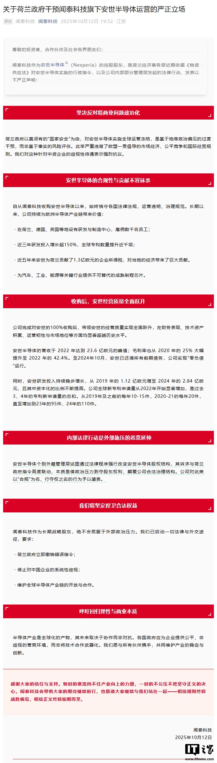 聞泰科技 10 月 12 日晚發(fā)表聲明,譴責(zé)荷蘭政府以“國(guó)家安全”為由凍結(jié)安世半導(dǎo)體全球運(yùn)營(yíng),稱此舉違背市場(chǎng)經(jīng)濟(jì)原則。安世半導(dǎo)體個(gè)別外籍管理層試圖通過(guò)法律程序改變股權(quán)結(jié)構(gòu),聞泰科技認(rèn)為這是借政治壓力剝奪股東權(quán)利。公司表示將捍衛(wèi)合法權(quán)益,呼吁回歸商業(yè)本質(zhì)。