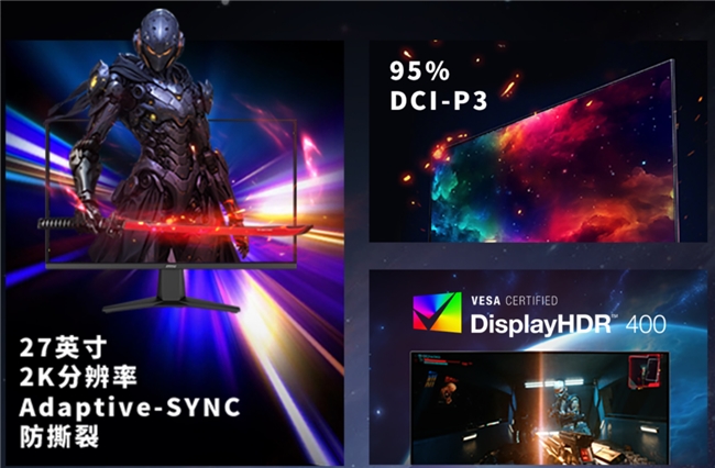 此外,顯示器支持HDR400高動態(tài)范圍,亮度達400cd/m²,配合95% DCI-P3廣色域覆蓋,無論是游戲畫面還是影視內(nèi)容,均能呈現(xiàn)豐富層次與鮮活色彩。