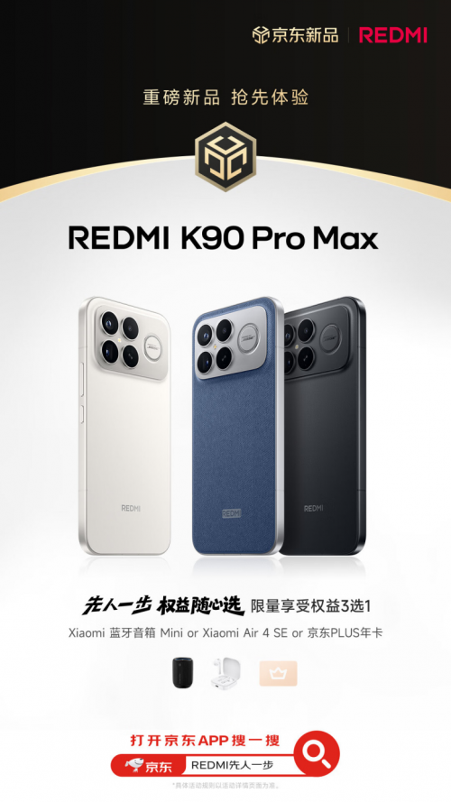 REDMI K90系列將于10月23日發(fā)布,引發(fā)眾多消費(fèi)者關(guān)注。為帶給消費(fèi)者更多權(quán)益,京東攜手小米打造先人一步加速換新計(jì)劃,先人一步下單REDMI K90 Pro Max 16GB+512GB可享限量權(quán)益隨心選,包括Xiaomi藍(lán)牙音箱mini、Xiaomi Air 4 SE、京東PLUS年卡,三項(xiàng)權(quán)益可任選其一。京東11.11火熱進(jìn)行中,即日起消費(fèi)者可到京東APP搜索“REDMI先人一步”進(jìn)入活動(dòng)頁面預(yù)約新機(jī),方便發(fā)布會(huì)后第一時(shí)間下單。