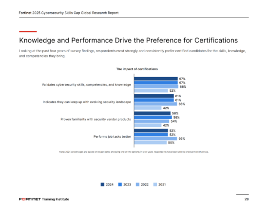 面對持續(xù)存在的人才短缺困境,專業(yè)認(rèn)證的價值持續(xù)獲得業(yè)界認(rèn)可。89%的IT決策者更傾向于雇用持有專業(yè)認(rèn)證的候選人,認(rèn)為認(rèn)證能有效驗證知識儲備(67%)、體現(xiàn)技術(shù)適應(yīng)能力(61%)并證實對關(guān)鍵工具的熟練度(56%)。然而,與此趨勢相悖的是,企業(yè)對認(rèn)證資助的投入在2024年出現(xiàn)縮減,僅有73%的受訪者表示愿意為員工支付認(rèn)證費用,低于2023年的89%。
