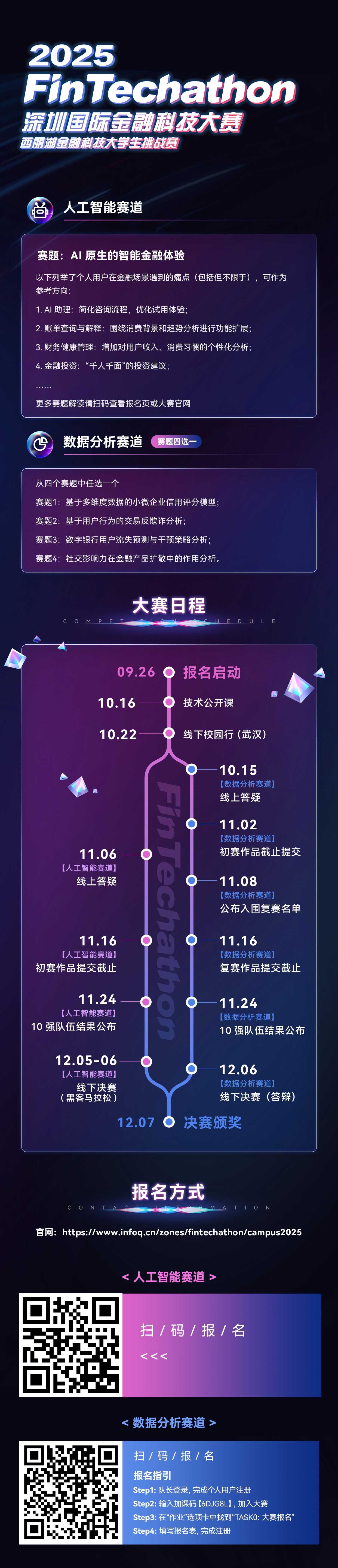 為了滿足金融科技產(chǎn)業(yè)技術(shù)創(chuàng)新及人才需求,更好地推動金融科技產(chǎn)業(yè)發(fā)展,由深圳市地方金融管理局進行戰(zhàn)略指導(dǎo),深大微眾金融科技學(xué)院、微眾銀行、InfoQ 極客傳媒、狗熊會等多方聯(lián)合舉辦的“2025 深圳國際金融科技大賽(FinTechathon)——西麗湖金融科技大學(xué)生挑戰(zhàn)賽”(下文稱“大賽”)于9月26日正式開賽。
