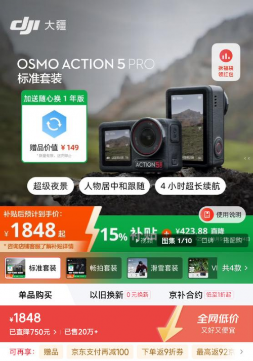 作為大疆旗下首款Pro級運動相機產(chǎn)品,Osmo Action 5 Pro不僅延續(xù)了前作的優(yōu)點,更以Pro級畫質(zhì)、超強防抖、長續(xù)航和深度防護,重新定義了運動相機的專業(yè)標準,無論是極限運動記錄還是日常創(chuàng)作,均能提供可靠且高品質(zhì)的影像解決方案。Osmo Action 5 Pro標準套裝活動期間僅需1848元,購買同樣加送1年版隨心換,數(shù)量有限,想買的朋友盡快下手。
