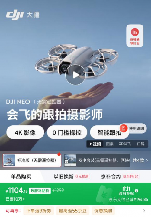 DJI Neo被譽為“25年最值得入手的入門級航拍神器”,僅重249克,支持4K高清視頻與智能跟隨。這款設(shè)備專為學生、親子家庭設(shè)計,輕巧便攜,操作簡單,適合新手快速上手,支持自動跟拍人像、車輛、寵物,甚至能識別特定顏色目標,讓拍攝不再依賴技術(shù);顒悠陂g單機享政府補貼立減194.85元,到手僅需1104.15元。