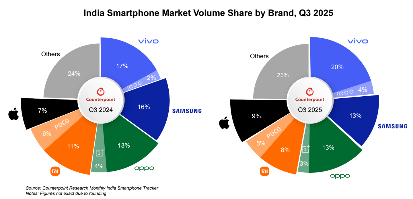 Counterpoint:蘋果 2025 年 Q3 首次躋身印度市場出貨量前五,vivo 穩(wěn)居榜首