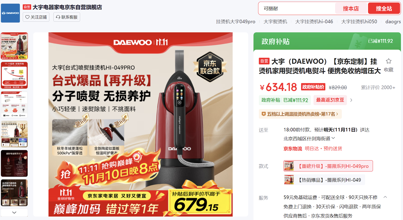 秋冬衣物收納太久易起皺,大宇京東定制款掛燙機,全新升級分子噴熨技術(shù),高效除皺更護衣,羽絨服也能熨出蓬松感。京東11.11期間下單享雙重補貼,到手價634.18元,曬單送熨衣板。
