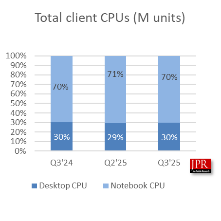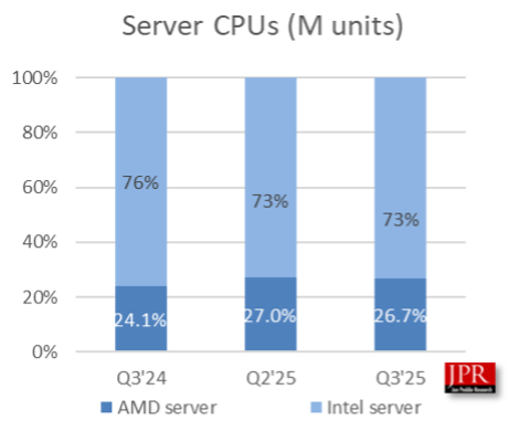 JPR:全球客戶端 CPU 市場 2025Q3 環(huán)比增長 2.2%、同比下降 2.2%