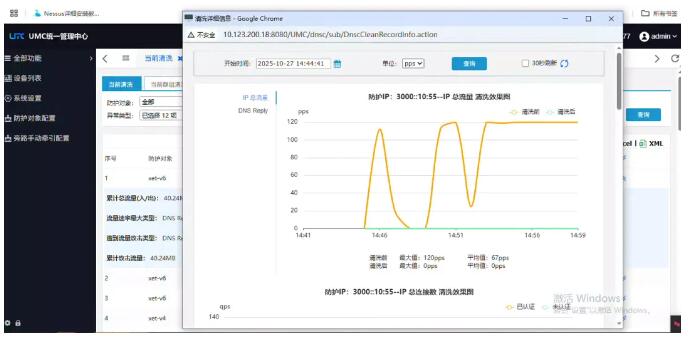 3.測(cè)試儀表發(fā)送1Gbps的混合攻擊報(bào)文,攻擊類型包括:NTP反射攻擊、Memcached反射攻擊、SSDP反射攻擊、CLDAP反射攻擊、DNS反射攻擊。攻擊和背景流量的源地址不重疊,攻擊的目的地址為背景流量部分目的IP,攻擊發(fā)送持續(xù)時(shí)間10分鐘。