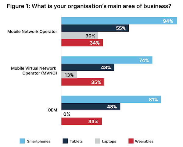 根據(jù)《User appetites for frictionlesseSIM activation》給出的調(diào)查結(jié)果,從全球的電信運(yùn)營商來看,其中智能手機(jī)已經(jīng)成為eSIM業(yè)務(wù)的主要領(lǐng)域,平板電腦位居次席,筆記本電腦、可穿戴設(shè)備和物聯(lián)網(wǎng)設(shè)備占到約三分之一。而虛擬運(yùn)營商的eSIM設(shè)備業(yè)務(wù)略有不同,盡管智能手機(jī)同樣是其主要業(yè)務(wù),但平板電腦和筆記本電腦的業(yè)務(wù)占比較少。
