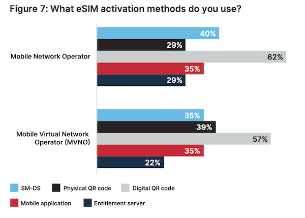 根據(jù)近期Thales與MobileWorldLive共同開展的調(diào)查報(bào)告《User appetites for frictionlesseSIM activation》,目前最受歡迎的激活方式為數(shù)字二維碼,62%的MNO和57%的MVNO正在使用這種方式。其次最受歡迎的方法是SM-DS,40%的MNO和略高于三分之一的MVNO選擇了這一方法。使用移動應(yīng)用程序激活eSIM配置文件的比例與SM-DS相近。