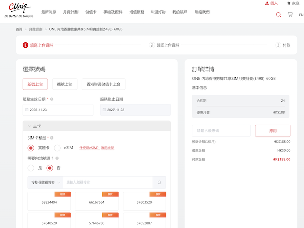 另如中國聯(lián)通香港,在當(dāng)?shù)卦沦M(fèi)計(jì)劃的選購辦理頁面中,也會主動提供實(shí)體卡與eSIM兩種類型選項(xiàng),方便用戶進(jìn)行辦理。
