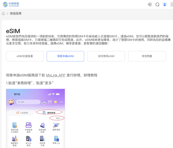 此外,在傳統(tǒng)eSIM激活服務(wù)中,即便是國內(nèi)電信運(yùn)營商在開展境外業(yè)務(wù)的過程中,同樣以簡化服務(wù)、提升便利性為賣點(diǎn)。例如中國移動香港的eSIM增值服務(wù)頁面中顯示“只需掃描二維碼即可完成開通”,業(yè)務(wù)申請只需在MyLink APP進(jìn)行辦理,無需前往實(shí)體營業(yè)廳。