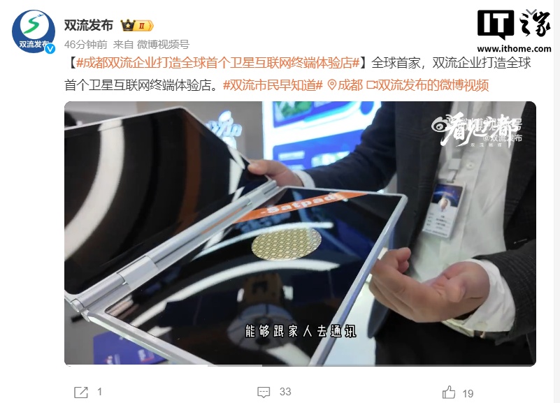11 月 19 日消息,據(jù)“雙流發(fā)布”今日消息,成都迅翼衛(wèi)通科技有限公司(StarWin)“迅翼衛(wèi)通”衛(wèi)星互聯(lián)網(wǎng)線下體驗店于 11 月 18 日正式開業(yè)運營,這是全球首個衛(wèi)星互聯(lián)網(wǎng)終端體驗店