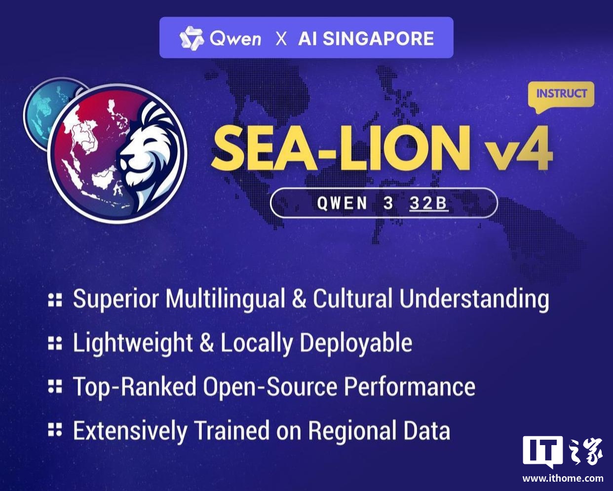11 月 25 日消息,阿里巴巴集團(tuán)旗下的阿里云于 11 月 24 日宣布,將為新加坡國家人工智能計劃(AI Singapore,簡稱 AISG)最新版本的“Sea-Lion”大語言模型(LLM)—— 即 Qwen-Sea-Lion-v4 提供技術(shù)支持。值得一提的是,AISG 此次是放棄了 Meta 模型,轉(zhuǎn)向阿里巴巴的通義千問 Qwen 開源架構(gòu)。