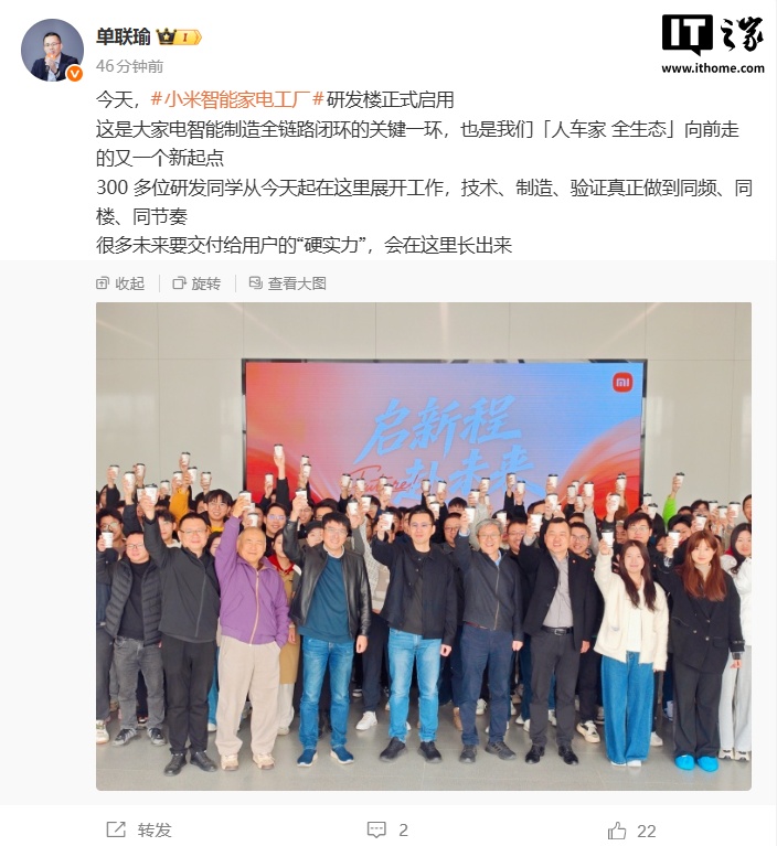單聯(lián)瑜稱,“這是大家電智能制造全鏈路閉環(huán)的關(guān)鍵一環(huán),也是我們「人車家全生態(tài)」向前走的又一個新起點。300 多位研發(fā)同學(xué)從今天起在這里展開工作,技術(shù)、制造、驗證真正做到同頻、同樓、同節(jié)奏。很多未來要交付給用戶的“硬實力”,會在這里長出來!