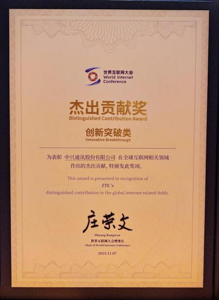 喜報(bào)!中興通訊榮獲2025年世界互聯(lián)網(wǎng)大會(huì)杰出貢獻(xiàn)獎(jiǎng)