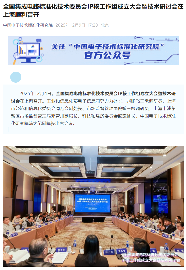 12 月 9 日消息,據(jù)中國(guó)電子技術(shù)標(biāo)準(zhǔn)化研究院今日消息,2025 年 12 月 4 日,全國(guó)集成電路標(biāo)準(zhǔn)化技術(shù)委員會(huì) IP 核工作組成立大會(huì)暨技術(shù)研討會(huì)在上海召開(kāi)。