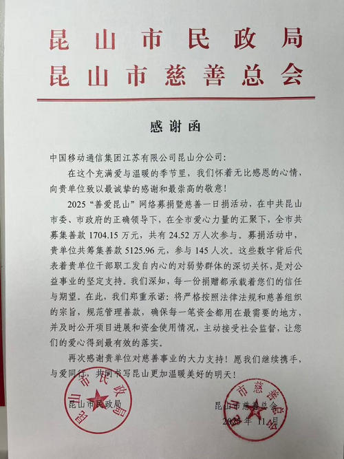 近日,中國(guó)移動(dòng)江蘇公司蘇州昆山分公司收到昆山市民政局、昆山市慈善總會(huì)發(fā)來(lái)的感謝函與慈善捐贈(zèng)證書(shū),對(duì)其在2025年“善愛(ài)昆山”網(wǎng)絡(luò)募捐活動(dòng)中的積極貢獻(xiàn)予以高度認(rèn)可和誠(chéng)摯感謝。這一榮譽(yù)不僅是對(duì)昆山分公司員工愛(ài)心的褒獎(jiǎng),更是對(duì)蘇州移動(dòng)長(zhǎng)期以來(lái)積極履行社會(huì)責(zé)任、投身公益事業(yè)企業(yè)形象的生動(dòng)印證。