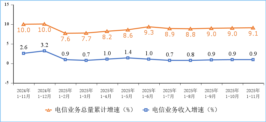 電信業(yè)務(wù)收入穩(wěn)步增長,電信業(yè)務(wù)總量小幅回升。前11個月,電信業(yè)務(wù)收入累計完成16096億元,同比增長0.9%。按照上年不變價計算的電信業(yè)務(wù)總量同比增長9.1%。
