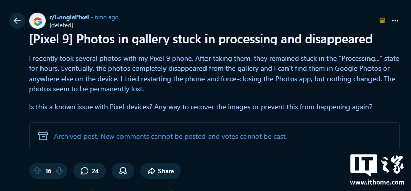 12 月 24 日消息,據(jù) AndroidAuthority 報(bào)道,部分谷歌 Pixel 系列手機(jī)出現(xiàn)異常故障,導(dǎo)致用戶照片丟失。近日,有多位 Reddit 論壇用戶發(fā)帖反映,用 Pixel 手機(jī)拍攝的照片“不翼而飛”,既未出現(xiàn)在本地存儲(chǔ)中,也沒(méi)有備份到谷歌相冊(cè)(Google Photos)。