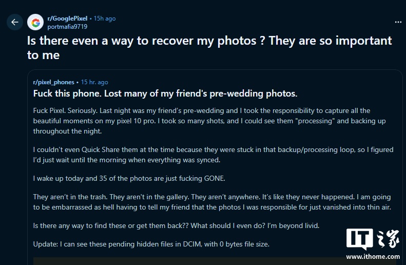 此外,Reddit 上還有一則發(fā)布者賬號(hào)已注銷(xiāo)的舊帖,內(nèi)容也與該問(wèn)題高度相似。有評(píng)論者表示,自己的 Pixel 10 Pro、Pixel 10、Pixel 9a 和 Pixel 8a 機(jī)型均出現(xiàn)過(guò)相同故障。從用戶反饋來(lái)看,許多受影響者都是在短時(shí)間內(nèi)拍攝大量照片后遭遇此問(wèn)題;還有多名用戶稱,在手機(jī)的 DCIM 文件夾中發(fā)現(xiàn)了一批異常的 JPG 文件,這些文件名稱中均包含“pending”(待處理)字樣,且文件大小均為零字節(jié)。