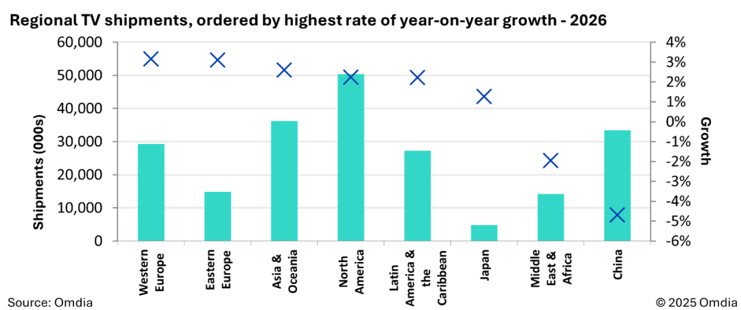 預(yù)計(jì) 2026 年增長最快的市場將出現(xiàn)在歐洲,其中西歐電視出貨量預(yù)計(jì)增長 3.2%,東歐出貨量預(yù)計(jì)增長 3.1%。作為賽事舉辦地的北美市場也有望實(shí)現(xiàn)穩(wěn)健增長,增幅約為 2.2%。
