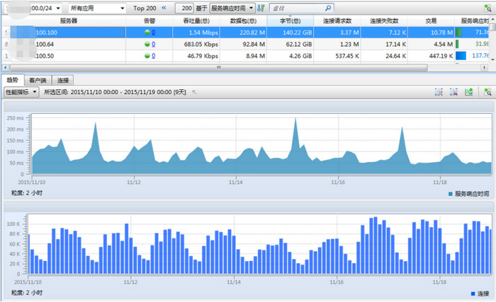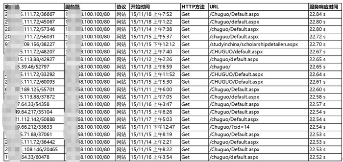 通過(guò)在該部門(mén)數(shù)據(jù)中心核心交換機(jī)部署xnSight進(jìn)行全流量采集與長(zhǎng)期監(jiān)測(cè),平臺(tái)很快發(fā)現(xiàn)門(mén)戶網(wǎng)站整體服務(wù)響應(yīng)時(shí)間接近100ms,偏高。進(jìn)一步針對(duì)HTTP會(huì)話進(jìn)行深度分析,發(fā)現(xiàn)出國(guó)業(yè)務(wù)相關(guān)URL的響應(yīng)時(shí)間異常突出,普遍達(dá)到數(shù)十秒,其中繳費(fèi)查詢與提交接口最為嚴(yán)重。