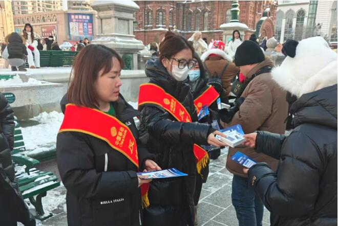 活動現(xiàn)場,哈爾濱移動市場經營部與道里分公司精心策劃,組建了一支專業(yè)且熱忱的反詐宣傳團隊。她們身著厚重的羽絨服,于索菲亞教堂、尚志大街等人流密集區(qū)域設置宣傳點,通過發(fā)放反詐宣傳手冊、現(xiàn)場講解典型案例、播放反詐宣傳視頻等多樣形式,向游客和當?shù)鼐用衿占俺R姷耐ㄐ旁p騙手段及防范舉措。