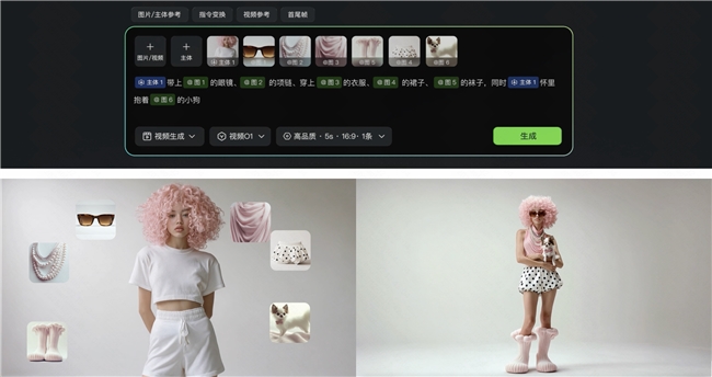 針對(duì)AI視頻難以落地的痛點(diǎn)——角色與場(chǎng)景的一致性,可靈O1底層強(qiáng)化了對(duì)輸入圖像及視頻的理解。 它能像人類(lèi)導(dǎo)演一樣,“記住”主角、道具和場(chǎng)景。無(wú)論鏡頭如何流轉(zhuǎn),主體特征始終穩(wěn)定如一。 此外,該模型展現(xiàn)了強(qiáng)大的多主體融合能力。用戶可以自由組合多個(gè)不同主體,或?qū)⒅黧w與參考圖混搭。即便是在復(fù)雜的群像戲或互動(dòng)場(chǎng)景中,模型也能獨(dú)立鎖定并保持每一位角色或道具的特征,確保“主角”在不同鏡頭中實(shí)現(xiàn)工業(yè)級(jí)的特征統(tǒng)一。