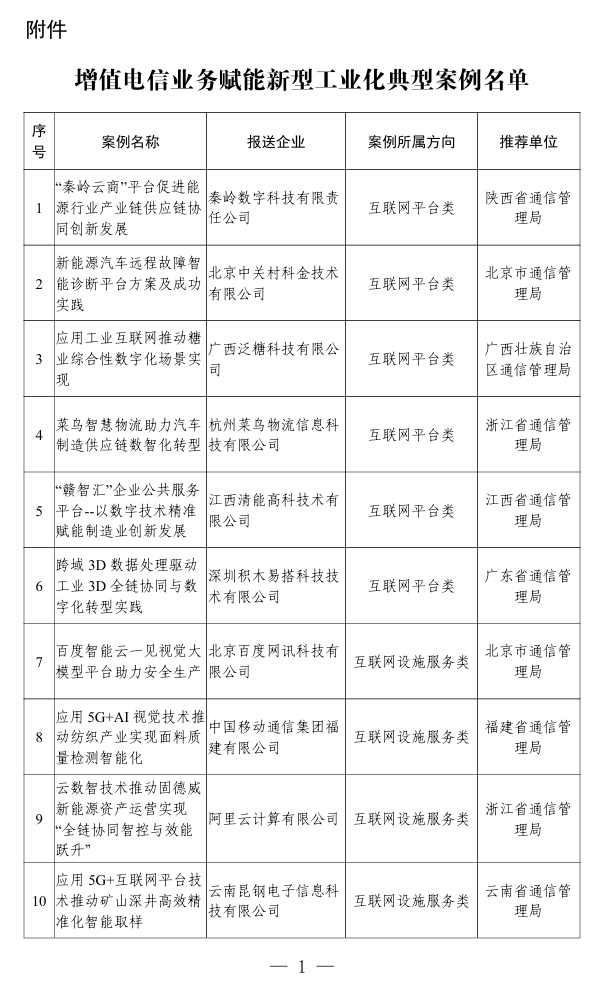 飛象網(wǎng)訊(致新/文)12月31日消息,工信部信息通信管理局發(fā)文稱,根據(jù)《工業(yè)和信息化部辦公廳關(guān)于開展增值電信業(yè)務(wù)賦能新型工業(yè)化典型案例征集工作的通知》,經(jīng)企業(yè)自主申報(bào)、地方推薦、專家評(píng)審和復(fù)核,現(xiàn)將評(píng)選出的增值電信業(yè)務(wù)賦能新型工業(yè)化典型案例進(jìn)行公示,請(qǐng)社會(huì)各界監(jiān)督。如有異議,請(qǐng)于公示期內(nèi)提出書面反饋意見(jiàn),并明確提出異議的事實(shí)依據(jù)、真實(shí)姓名、工作單位和聯(lián)系方式等。