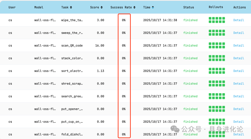 相比之下,自變量的wall-oss-flow 在相同條件下的表現(xiàn)明顯偏弱。測(cè)評(píng)結(jié)果顯示:wall-oss-flow共測(cè)試31次,其中2次成功率為60%,1次成功率為50%,1次成功率為20%,其余所有任務(wù)成功率均為0。
