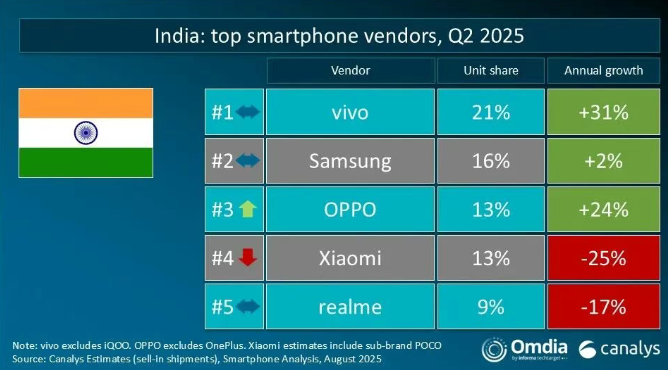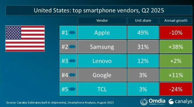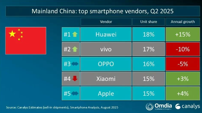 Canalys 報(bào)告 2025Q2 全球主要市場手機(jī)出貨量:華為中國大陸第一、vivo 印度第一、蘋果美國第一