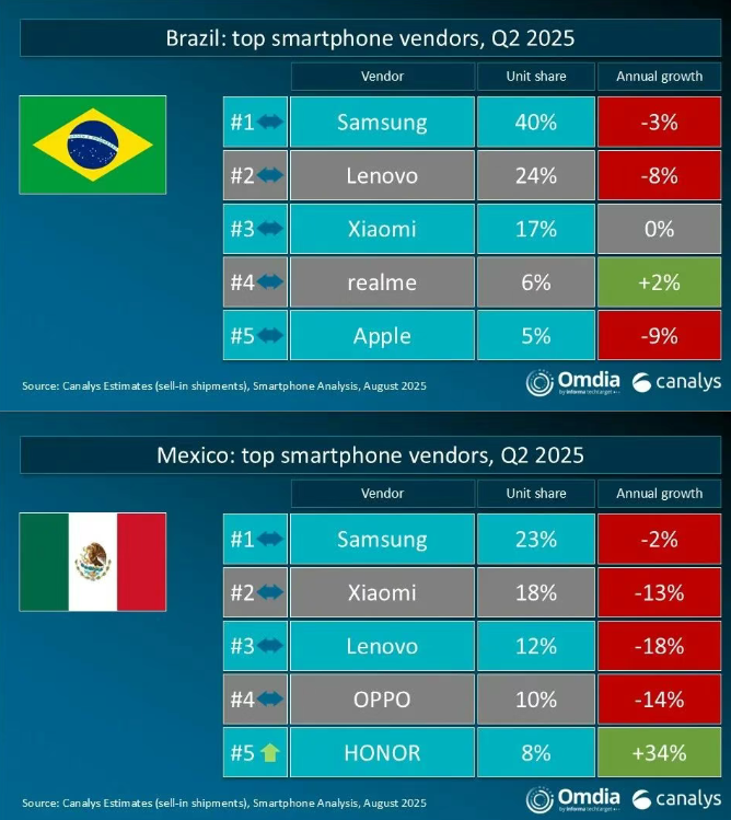 此外,Canalys 還公布了巴西、墨西哥市場的排名情況,均由三星排名第一,聯(lián)想、小米進(jìn)入市場前三。