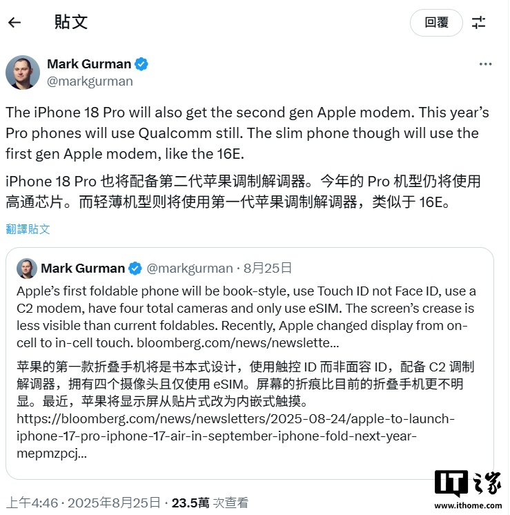 彭博社記者古爾曼昨天在 X 平臺(tái)透露,蘋(píng)果 iPhone18 Pro 將配備蘋(píng)果自研的第二代基帶。