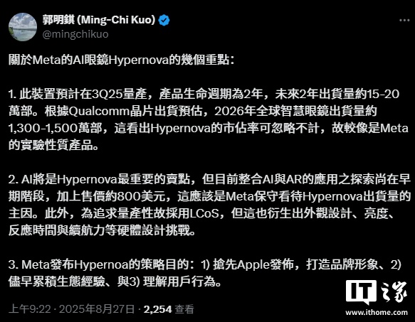 郭明錤在其社交媒體上表示,根據(jù)高通芯片出貨預(yù)估,2026 年全球智能眼鏡出貨量將達(dá)到 1,300-1,500 萬(wàn)部。因此 Hypernova 的市占率可忽略不計(jì),該產(chǎn)品更像是 Meta 的實(shí)驗(yàn)性產(chǎn)品。