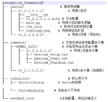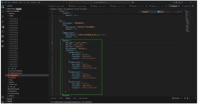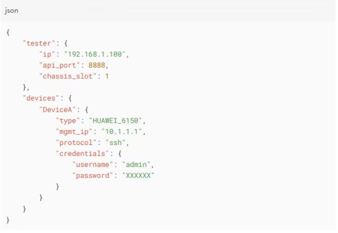 測(cè)試拓?fù)溥B接信息寫入testbed.json文件中,修改對(duì)應(yīng)的測(cè)試儀表,交換機(jī)設(shè)備的 ip 和實(shí)際端口即可適配不同的測(cè)試環(huán)境。