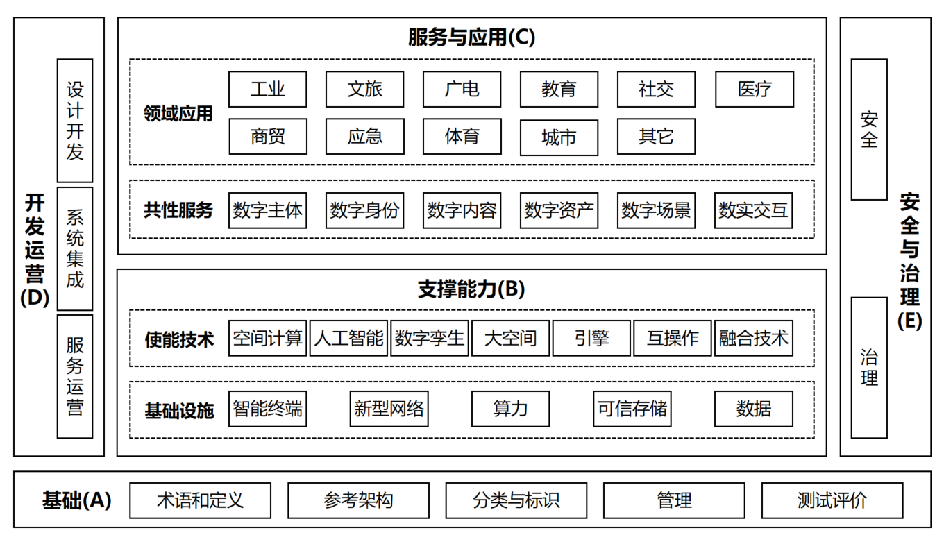 元宇宙標準體系主要包括基礎(chǔ)、支撐能力、服務與應用、開發(fā)運營、安全與治理等五大部分,如下圖所示: