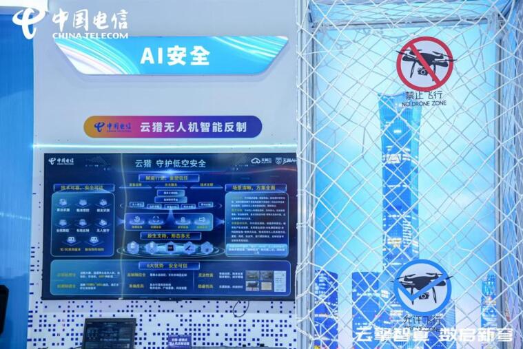在AI安全展區(qū),“云獵”無人機(jī)反制系統(tǒng)現(xiàn)場(chǎng)上演一場(chǎng)“空中抓捕”:一架模擬“黑飛”的穿越機(jī)剛闖入禁飛區(qū),瞬間被AI偵測(cè)到并鎖定,隨即觸發(fā)反制進(jìn)行處置,全程不到3秒。