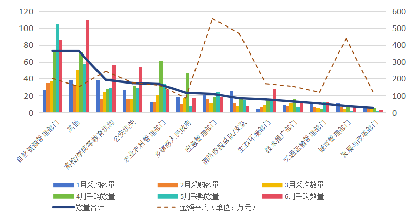 上半年公開投資采購市場(chǎng)整體呈現(xiàn)上升趨勢(shì),自然資源管理和應(yīng)急管理部門采購需求最為旺盛。上半年公開采購累計(jì)發(fā)生1830起,已披露總金額達(dá)到39億元。其中五月采購金額位居榜首,占上半年全部采購金額的25%。自然資源管理部門和應(yīng)急管理部門上半年共計(jì)采購13億元,采購金額位居前二。此外,應(yīng)急管理、消防救援、城市管理等部門財(cái)力雄厚,平均采購金額位居前三。