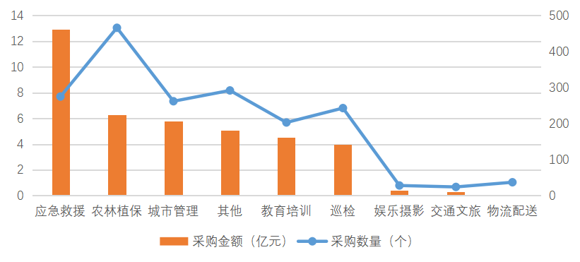 應(yīng)急救援和農(nóng)林植保是目前發(fā)展較為成熟的場(chǎng)景,應(yīng)急救援類相對(duì)單價(jià)更高。農(nóng)林植保上半年采購數(shù)量最多,共發(fā)生466起;應(yīng)急救援類場(chǎng)景采購金額最多,超12億元,其中無人機(jī)或直升機(jī)以及配件等硬件金額占比達(dá)90.6%。以政府主導(dǎo)的公共服務(wù)類場(chǎng)景如應(yīng)急救援等大單相對(duì)集中,與政策補(bǔ)貼資金流向相同,如應(yīng)急部門上半僅發(fā)生110次采購,平均每筆采購事件達(dá)到555萬元。行業(yè)類采購如農(nóng)林植保高頻小單較多,部分農(nóng)業(yè)公司提供防治等服務(wù),服務(wù)價(jià)格相對(duì)采購更低,依據(jù)防治面積定價(jià)(目前單價(jià)≤20元/畝)或隨采購農(nóng)藥產(chǎn)品搭售。