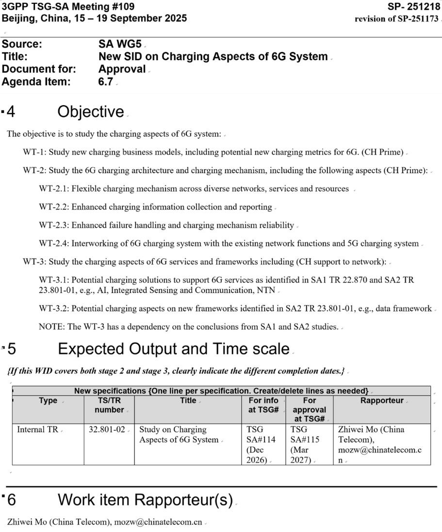 據(jù)介紹,在 9 月 16 日至 19 日于北京召開的 3GPP 業(yè)務(wù)與系統(tǒng)技術(shù)規(guī)范組(TSG SA)第 109 次全會上,由中國電信研究院牽頭的“6G 系統(tǒng)計費研究”項目正式獲批通過,實現(xiàn)中國電信在 3GPP 國際標準組織的 6G 牽頭立項突破。該項目是 3GPP SA5 工作組首個獲批的 6G 項目。