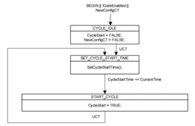 SetCycleStartTime()過程確定下一個GCL執(zhí)行周期開始的時間。該過程根據(jù)Current Time、Oper Base Time、Oper Cycle Time、Oper Cycle Time Extension、Config Change Time和Config Pending的值,將Cycle Start Time變量設置為起始時間,具體規(guī)則如下: