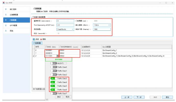 門控中依次添加三個GCL列表項,門狀態(tài)中指定門狀態(tài),0為關門,1為開門。列表0放行優(yōu)先級0流量、列表1放行優(yōu)先級1流量、列表2放行3、4、5、6優(yōu)先級流量。門狀態(tài)持續(xù)時長設置每個列表的持續(xù)時間,所有列表持續(xù)時間之和為Oper Cycle Time此例設置每個GCL持續(xù)時間為1ms,Oper Cycle Time為3ms;過濾器索引為測試儀統(tǒng)計不同GCL放行流量的落點情況。(門控規(guī)則與DUT保持一致)