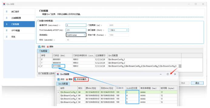 配置Qbv流量,點擊自動創(chuàng)建流量會自動生成對應優(yōu)先級的Qbv流,也可以點擊“添加”手動創(chuàng)建其他流量,配置測試類型為Continuous。