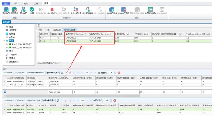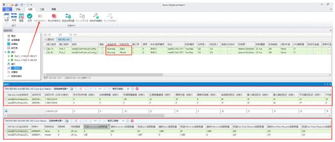 配置AS協(xié)議并點擊完成,在配置導航欄中可看到生成的AS協(xié)議,點擊啟動所有協(xié)議,能看到測試儀Telkerd端口AS時鐘狀態(tài)為Slave,Listener端口AS時鐘狀態(tài)為Master,統(tǒng)計中能看到時間偏移量及協(xié)議包交互數(shù)量均正常,時間同步是Qbv調(diào)度基準時間的基石,需優(yōu)先確保其建立成功。