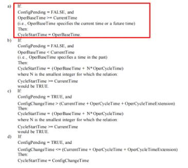 3、Config Pending=TRUE,且Config Change Time>(Current Time+Oper Cycle Time+Oper Cycle Time Extension)那么Cycle StartTime=(Oper Base Time+N*Oper Cycle Time)其中N是滿足關系式的最小整數(shù);