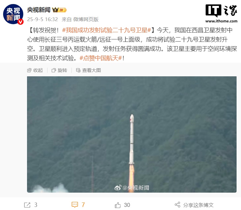 9 月 5 日消息,據(jù)央視新聞報(bào)道,北京時(shí)間 2025 年 9 月 5 日 10 時(shí) 34 分,我國(guó)在西昌衛(wèi)星發(fā)射中心使用長(zhǎng)征三號(hào)丙運(yùn)載火箭 / 遠(yuǎn)征一號(hào)上面級(jí),成功將試驗(yàn)二十九號(hào)衛(wèi)星發(fā)射升空,衛(wèi)星順利進(jìn)入預(yù)定軌道,發(fā)射任務(wù)獲得圓滿成功。